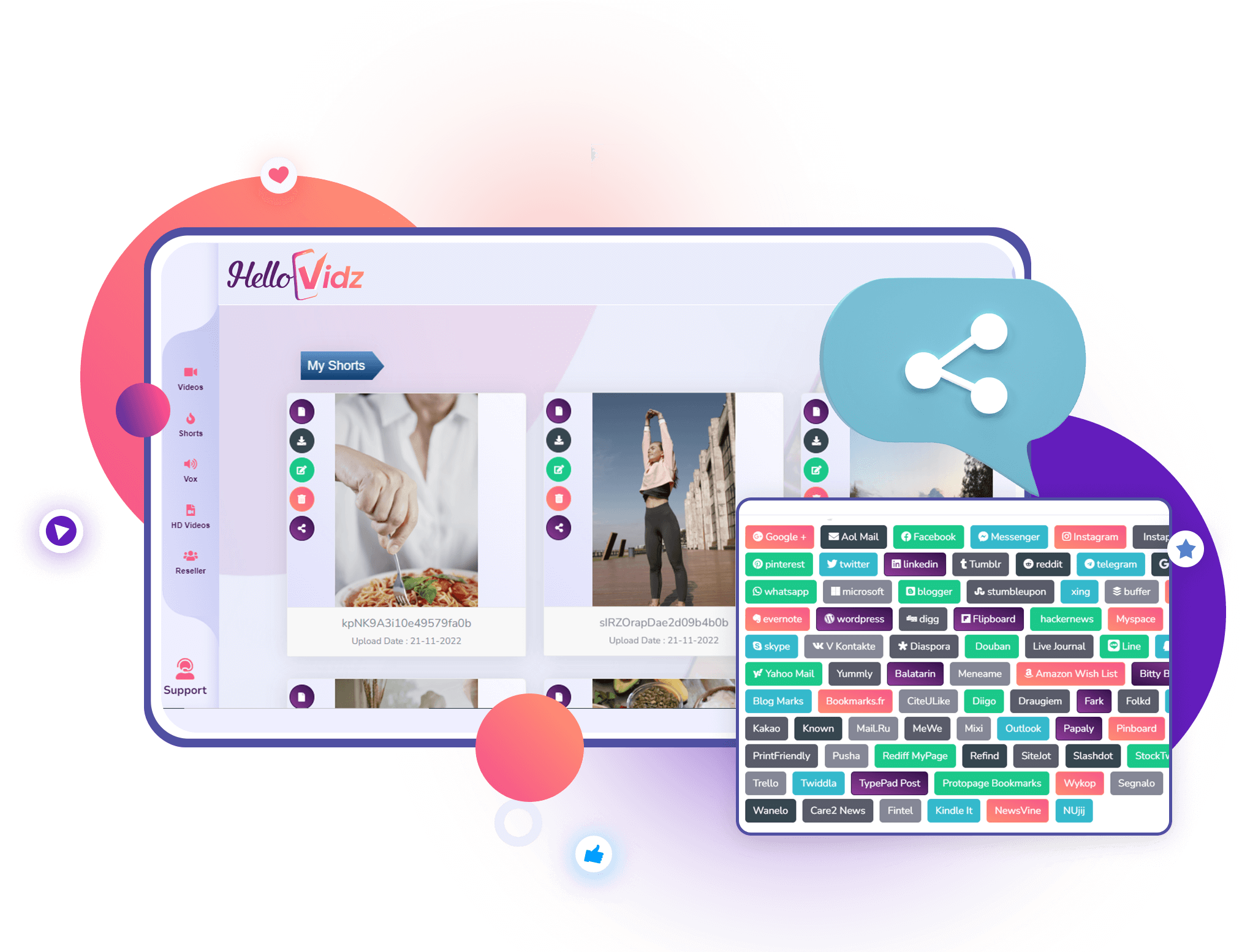 It’s not Just YouTube, Instagram, facebook, but HelloVidz gives you access to 70+ social channels to share your video directly from inside the App.
